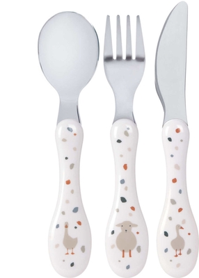 Mit dem LÄSSIG Kinderbesteck schmeckt das Essen gleich doppelt so gut. Kleine niedliche Prints zieren die kindgerechten Griffe. Das Besteck Set aus Gabel, Löffel und Messer ist BPA-frei und aus rostfreiem, nicht verformbarem Edelstahl mit Griffen aus Kunststoff. Dank seinen abgerundeten Kanten ist das Messer auch schon für die kleinsten Feinschmecker geeignet und bringt spielerisch das eigenständige Essen bei. Das Kinderbesteck ist leicht sowie spülmaschinengeeignet und für Kinder ab 1 Jahr geeignet. Produktinformationen • Griff: 100% ABS, Edelstahl • Lebensmittelkontakt, aber nicht für die Mikrowelle geeignet • Spülmaschinengeeignet