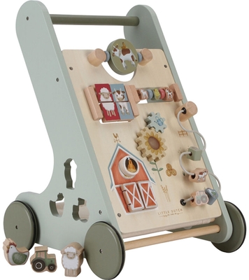 Laufen, spielen und lernen! Dieser hölzerne Aktivitätslaufwagen bietet verschiedene herausfordernde Aktivitäten, die die Entwicklung der motorischen Fähigkeiten Ihres Kindes unterstützen. Fordern Sie Ihr Baby mit den vielen Aktivitäten auf diesem schön dekorierten Laufwagen heraus. Es gibt 8 Aktivitäten zu entdecken und zu meistern, wie das Vollenden der Tiere im Stall durch Drehen der Blöcke. Mit seinem robusten Design eignet sich der Laufwagen für Kinder ab 12 Monaten, die bereit für ihre ersten Schritte sind. Bereiten Sie sich auf enthusiastische Ermutigungen vor, wenn Ihr Kleines mit diesem Laufwagen leicht durch das Haus geht. Die Gummireifen verhindern Kratzer auf Ihrem Boden. Der Zusammenbau ist durch einen Erwachsenen vorzunehmen. • Altersempfehlung: ab 12 Monaten