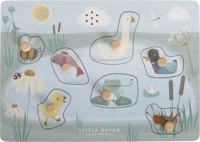 Lern die Gans und Ihre Freunde kennen! Mit diesem lustigen Puzzle lernt das Kind die Gans und ihre Freunde und die Formen und Geräusche kennen, die dazu gehören. Wenn das Puzzlestück wieder an den richtigen Platz gesetzt wird, macht es ein für die Abbildung typisches Geräusch: es piept, quakt, planscht, oder summt. Das Spiel ist entwickelt für Kleinkinder, um die Lebewesen rund um den Teich auf dem Land kennenzulernen. Dieses lustige Puzzle mit 7 Tieren und Geräuschen fördert die H&-Auge-Koordination und stimuliert den Wortschatz Ihres Kindes.