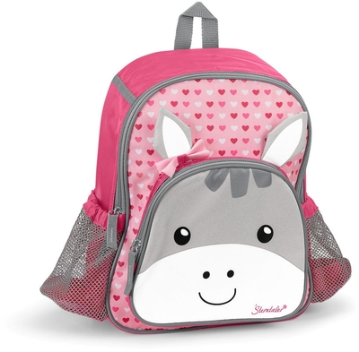 Der praktische Funktions-Rucksack Esel Emmi Girl in Rosa und Grau mit komfortablem Trageriemen ist der perfekte Begleiter für unterwegs. Das Esel-Gesicht und der niedliche Herzchen-Print lassen Kinderherzen höherschlagen und machen Lust auf den Kindergarten. In den praktischen Rucksack mit vielen Fächern und seitlichen Netztaschen passen nicht nur Brotdose und Trinkflasche, sondern auch Spielsachen, die unterwegs nicht fehlen dürfen. Der süße Rucksack bietet Platz für alles, was kleine Entdecker so brauchen. Die Schultergurte sind gepolstert und verstellbar und der Bauchgurt verschafft einen noch besseren Halt. Das Hauptfach mit doppeltem Zipper lässt sich leicht und sicher öffnen und das integrierte Namensschild garantiert, dass der Rucksack nicht verloren geht. Dank der angebrachten Reflektoren ist dein Liebling auch bei Dunkelheit gut zu sehen. Produktdetails • Größe (B x H x L in cm): 30 x 23 x 10 cm •