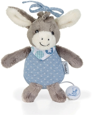 Das lächelnde Eselchen Emmi singt Deinen Schatz in den Schlaf Mit seiner beruhigenden Melodie " La Le Lu" begleitet Eselchen Emmi Deinen Schatz in den Schlaf und beschert hoffentlich angenehme Träume. Produkteigenschaften • mit Melodie: " La Le Lu" • austauschbares Spielwerk • mit Reißverschluss • waschbar Material • Oberstoff 1: 100% Polyester • Oberstoff 2: 100% Baumwolle Pflegehinweise • waschbar bei 40 Grad Celsius (Spielwerk vorher entfernen) Zusätzliche Produkthinweise Spieluhr mit herausnehmbarem Spielwerk Das Spielwerk ist herausnehmbar: Bitte vor dem Waschen entfernen! Bedienungsanleitung: Ziehen Sie bitte eine gebogene Büroklammer durch die Ã-ffnung des Sicherheitsreißverschlusses. Den Riegel anheben und den Reißverschluss dabei öffnen. Zum Schließen, den Reißverschluss zuziehen und die Büroklammer wieder entnehmen. Achtung! Das Spielwerk darf nicht in die Hände von Babys und Kleinkindern gelangen und muss nach dem Waschen wieder in die Spieluhr hinein gelegt werden!