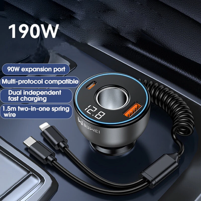 2-in-1 190W Car Lighter Charger Fast Charging With Retractable Data