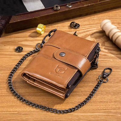 BULLCAPTAIN Cow Leather Men Wallet Short With Chain Multi Card Slot