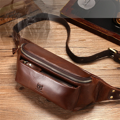 BULLCAPTAIN Men's Genuine Leather Fanny Bag Adjustable Strap Waist Bag Retro Crossbody Chest Bag