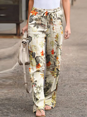 ZANZEA Women Linen Casual Pants Plus Size Womens Bohemia Floral Print Tube Long Pants Ladies Drawstring Wide Leg Trousers with Belt