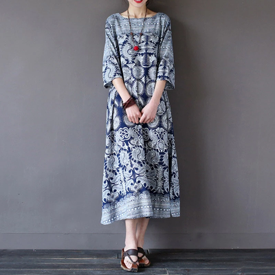ZANZEA Women Loose Retro Printing 3/4 Sleeve Maxi Dress