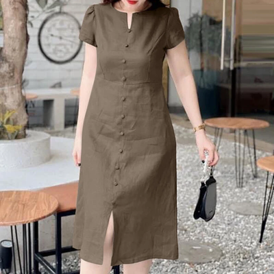 ZANZEA Women's Dresses Vintage Front Split Solid O-Neck Short Sleeve Dress