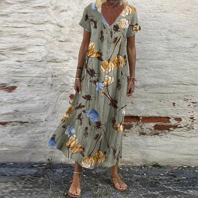 ZANZEA Women V-Neck Floral Printed Bohemian Leisure Casual Loose Dress