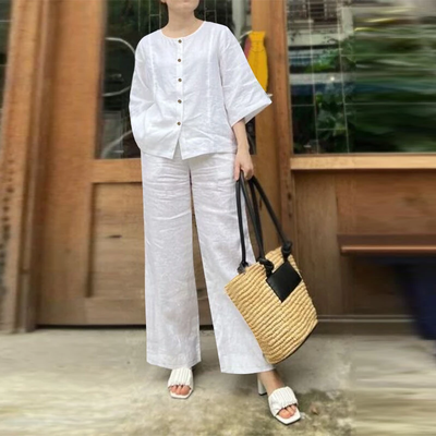 ZANZEA Women Vintage Crew Neck Long Sleeve Tops Elastic Waist Wide-Legged Pants Sets