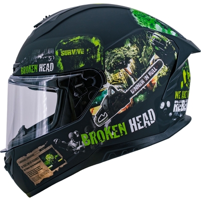 ACHTUNG: bei B-Ware Artikeln handelt es sich um Helme mit kleinen Mängeln Die Sicherheit und Schutzfunktion des Helmes ist natürlich voll gegeben einige Helme können leichte Kratzer aufweisen oder die Schutzfolie am Visier ist abgezogen Rüste Dich für die Apokalypse! Es ist passiert, das Ende der Welt, wie wir sie kennen. Eine Gruppe von rebellischen Motorradfahrern hat jetzt das Sagen. Für ihren Alltag in der Apokalypse haben sie einen Helm, der sie vor allen äußeren Umständen schützt: Der Broken Head Integralhelm Resolution in Grün! Er ist robust, selbst das Ende der Welt stört ihn nicht. Das Belüftungssystem des Resolution kühlt den Kopf in den hitzigen Situationen ab. Hol Dir den Broken Head Resolution und überstehe das Ende der Welt! Das Symbol des Widerstands! Optisch lässt Dich der Broken Head Resolution in eine Welt eintauchen, in der die alte Ordnung nicht mehr existiert... .