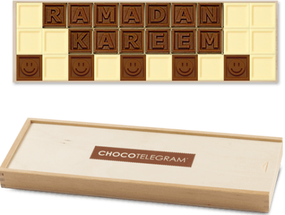 Die süße Ramadan Kareem Schoko-Nachricht, besteht aus 30 Schokoaldensteinen, die in einem edlen Holzkästchen verpackt sind. Die einzelnen Buchstaben bestehen aus Vollmilchschokolade und weißer Schokolade. Die köstliche Schokolade macht jedes Fastenbrechen zum Hochgenuss. Ein perfektes Geschenk sowohl für Kinder als auch für Erwachsene.