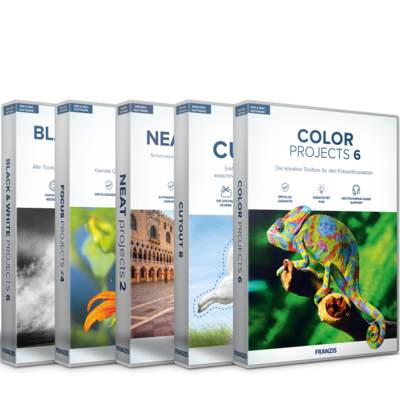 5 Tools für Spezialfälle der Bildbearbeitung Cut Out ist das TOP-Tool für digitale Bildmontagen. Mit der klar strukturierten Hightech-Toolbox von COLOR projects machen Sie wahre fotografische Meisterwerke. BW projects ist das optimale Tool für monochrome High-End-Bilder. NEAT projects befreit Sie von lästigen Menschenmassen in Ihren Bildern und danke FOCUS projects bekommen Ihre Makrobilder eine brillante Schärfe über das gesamte Bild.     Cut Out 8 Bildmotive perfekt ausschneiden, . .. ...