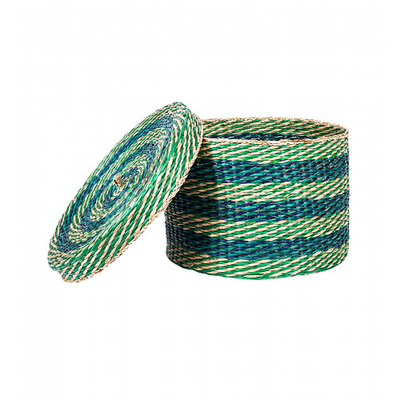 Die bunten Körbe werden per Hand aus nachhaltigem Seegras geflochten. Der Deckel schützt
