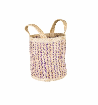 Aus gebleichter Jute wird dieser schicke Henkelkorb geflochten, der zur Aufbewahrung von Spielzeug und anderen Dingen geeignet ist. Die violette Farbe ist hierbei ein farbenfroher Blickfang.