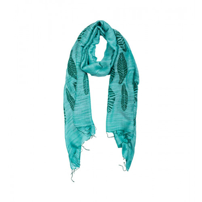 ...Der türkise Schal aus einem Viskose-Seiden Mix wird per Hand mit Blattranken bedruckt. Die modische Farbgebung