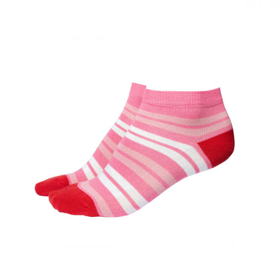 ...Und das im modernen Farbmix aus pinken und weißen Streifen mit rotem Kontrast an den Zehen und der Ferse. Natürlich bio und fair!