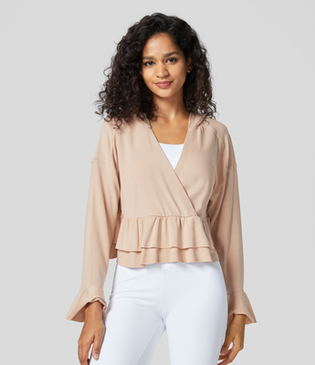Women. Einfarbiges, lässiges Oberteil mit V-Ausschnitt, Kapuze, Volantärmel und abgestufter Rüschensaum. Maschinenwäsche kalt. Nicht mit Chemikalien reinigen. Nicht bügeln. Nicht bleichen. Nur mit ähnlichen Farben waschen. Drehe den Stoff von innen nach außen. XL, L, M, S, XS. Novelle Peach, Schwarz
