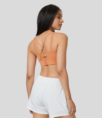Women. Rückenfreier Lauf-Sport-BH mit mittlerem Halt, überkreuzten Trägern und verstellbarem Verschluss. Maschinenwäsche kalt. Nicht mit Chemikalien reinigen. Nicht bügeln. Nicht bleichen. Nur mit ähnlichen Farben waschen. Drehe den Stoff von innen nach außen. M, S, XS. Smoke White violet, Snow White Oak, Pumpkin