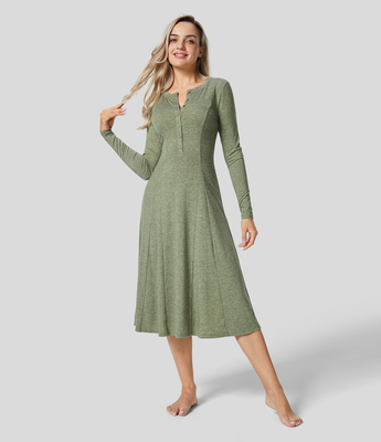 Halara - Rundhals-Knopf-Langarm-Flare-Midi-Freizeitkleid - Light Green