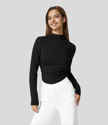 Women. Schlankes Oberteil mit Stehkragen, seitlichem Rüschen und abgerundetem Saum. Maschinenwäsche kalt. Nicht mit Chemikalien reinigen. Nicht bügeln. Nicht bleichen. Nur mit ähnlichen Farben waschen. Drehe den Stoff von innen nach außen. XL, L, M, S, XS. Camellia Brown, Schwarz