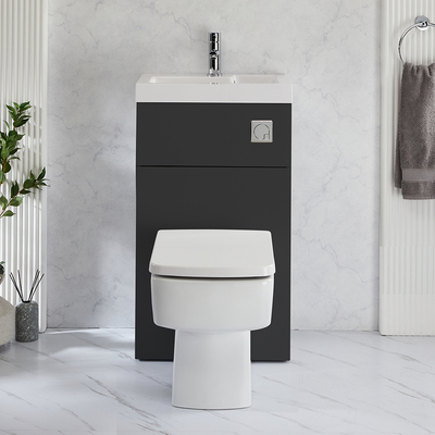 Die 2-in-1-Waschbecken- und WC-Kombination in Schwarzgrau mit einem Spülknopf in Chrom aus der Cluo-Kollektion, inklusive wassersparendem Unterputzspülkasten und einem Exton-WC, ist eine stilvolle und platzsparende Lösung für die kleinsten Badezimmer oder Gäste-WCs. Das 2-in-1-Element verfügt über ein Waschbecken und ist für die Verwendung mit einem St&-WC konzipiert, so wird der vorhandene Platz optimal ausgenutzt. Zudem verbirgt es unansehnliche Rohrleitungen und den im Lieferumfang enthaltenen Spülkasten. Eigenschaften: Dimensionen Einheit: B 500mm x T 356mm x H 830mm Dimensionen Waschbecken: B 502 x T 360mm x H 60mm Dimensionen Toilette: B 350mm x T 520mm x H 400mm Platzsparendes 2-in-1-Design 6/3-Liter-Einbau-Spülkasten Aus FSC-zertifiziertem Holzwerkstoff mit finish in Schwarzgrau Waschbecken aus Kunstharz mit einem Hahnloch (Mit Überlauf) Toilettensitz mit Schnellverschluss und Absenkautomatik Getestet und zertifiziert nach den Normen EN14749 und EN14688 Was wird mitgeliefert?2-in-1-...