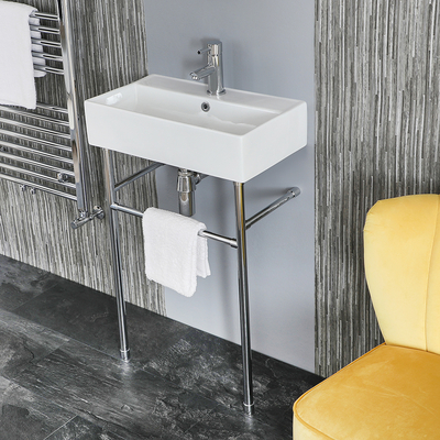 Sorgen Sie mit dem eleganten Halwell Waschbecken mit Metallgestell für einen modernem Look in Ihrem Badezimmer. Das Metallgestell besteht aus hochwertigem Edelstahl mit einem strapazierbaren Finish für garantierte Langlebigkeit. Es überzeugt mit einem minimalistischen Design und einer integrierten Handtuchstange, damit das Handtuch immer griffbereit ist. Das moderne Keramik-Waschbecken wird durch ein strapazierbares und zugleich pflegeleichtes Glasur-Finish in Weiß betont. Dank der Hahnlochvorbohrung eignet es sich zur Nutzung mit unseren Einhebel-Waschtischarmaturen, wodurch der Look abgerundet werden kann. Kombinieren Sie diesen mit anderen Artikeln aus der Halwell Kollektion um eine perfekt abgestimmte Badezimmereinrichtung mit modernem Look zu erzielen. Eigenschaften: Dimensionen: B 550mm x T 310mm x H 865mm Zeitgenössisches Design – ideal für moderne Badezimmer Integrierte Handtuchstange Mit einer Hahnloch-Vorbohrung – eignet sich zur Nutzung mit 1-Loch Waschtischarmaturen Waschbecken mit...