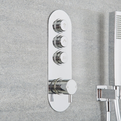 Gestalten Sie einen modernen Duschbereich in Ihrem Badezimmer mit der einfach zu Bedienenden Unterputz-Duscharmatur mit Drucktasten in Chrom, komplett mit 400mm rundem Duschkopf und einem Handbrauseset. Bei diesem Duschsystem haben Sie die Wahl zwischen einem Handbrauseset mit Auslassbogen inklusive Halterung oder einem Brausestangenset – treffen Sie einfach Ihre Auswahl aus den oben genannten Optionen. Die thermostatische Duscharmatur aus massivem Messing verfügt über eine einfach zu bedienende Druckknopfsteuerungen. Sie ermöglichen Ihnen den Wechsel zwischen den zwei Funktionen, aber Sie können diese zwei Funktionen auch gleichzeitig verwenden. Die Armatur verfügt zudem über eine Verbrühungsschutztechnologie, die jedes Mal eine sichere und komfortable Dusche gewährleistet. Der große Deckenduschkopf liefert einen luxuriösen Regeneffekt und sorgt so für ein entspannendes Duscherlebnis. Hergestellt aus Edelstahl, verfügt er über Silikondüsen, welche für eine mühelose Entfernung von Kalkabl... ...