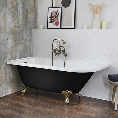 Setzen Sie mit der freistehenden Eck-Badewanne mit einer Rückenschrägen 1685mm x 750mm in Schwarz (Midnight Black) aus der Oxford-Kollektion ein stilvolles und gewagtes Statement in Ihrem Badezimmer. Mit dem klassischen Design, dem glänzenden Farbanstrich und den Standfüßen in gebürstetem Gold wird diese Badewanne mit Sicherheit zum neuen Blickfang in Ihrem Badezimmer. Dank der Rückenschräge können Sie ein komfortables und entspannendes Badeerlebnis genießen. Die Badewanne wurde aus hochwertigem Acrylgefertigt und bietet Ihnen somitlanglebige Stabilität, und eine Oberfläche, welche resistent gegen Verfärbungen und Kratzer ist. Verleihen Sie Ihrer Wanne mit einer unserer freistehenden oder W&-Wannenarmaturen den letzten Schliff und kombinieren Sie das Ensemble mit weiteren Artikeln aus der Oxford Kollektion, um einen abgestimmten Badezimmer-Look zu erzielen. Eigenschaften: Dimensionen: H 640mm x B 750mm x L 1685mm Badewannen-Füße in gebürstetem Gold Glänzende Oberfläche in Schwarz (Midnig...