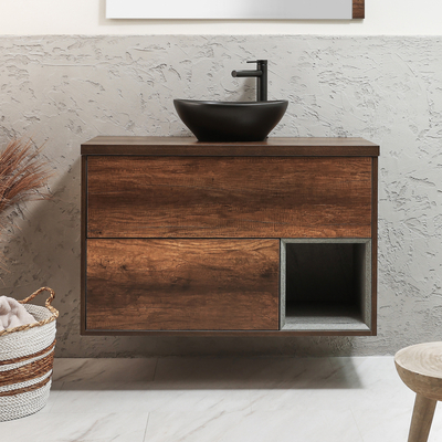 Verleihen Sie Ihrem Badezimmer mit dem hängenden 1000mm Waschtisch in dunkler Eiche aus der Hoxton-Kollektion mit ovalem Elements-Aufsatzwaschbecken in Graphit einen eleganten Stil. Hergestellt aus robustem Holzwerkstoff, ist der hängende Waschtischunterschrank eine stilvolle und praktische Aufbewahrungslösung. Er verfügt über ein offenes Regal und zwei Schubladen, welche Ihnen viel Platz zum Aufbewahren Ihrer Toilettenartikel bieten. Das Elements-Waschbecken aus hochwertiger Keramik verfügt über eine strapazierfähige Glasur, welche leicht zu reinigen ist. Es hat kein Hahnloch und kann somit ideal mit allen unseren hohen 1-Loch Waschtischarmaturen oder Wandarmaturen kombiniert werden. Vervollständigen Sie Ihr Badezimmer mit anderen Artikeln aus der Hoxton-Kollektion und kreieren so ein perfekt aufeinander abgestimmtes Bad. Eigenschaften: Dimensionen Unterschrank: B 1000mm x T 460mm x H 636mm Dimensionen Waschbecken: B 405mm x T 330mm H 140mm Modernes Design Konstruktion aus FSC-zertifiziertem...