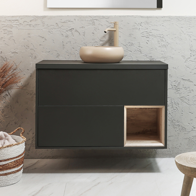 Verleihen Sie Ihrem Badezimmer mit dem hängenden 1000mm Waschtisch in Schwarzgrau aus der Hoxton-Kollektion mit rundem Elements-Aufsatzwaschbecken in Beige (Sand) einen eleganten Stil. Hergestellt aus robustem Holzwerkstoff, ist der hängende Waschtischunterschrank eine stilvolle und praktische Aufbewahrungslösung. Er verfügt über ein offenes Regal und zwei Schubladen, welche Ihnen viel Platz zum Aufbewahren Ihrer Toilettenartikel bieten. Das Elements-Waschbecken aus hochwertiger Keramik verfügt über eine strapazierfähige Glasur, welche leicht zu reinigen ist. Es hat kein Hahnloch und kann somit ideal mit allen unseren hohen 1-Loch Waschtischarmaturen oder Wandarmaturen kombiniert werden. Vervollständigen Sie Ihr Badezimmer mit anderen Artikeln aus der Hoxton-Kollektion und kreieren so ein perfekt aufeinander abgestimmtes Bad. Eigenschaften: Dimensionen Unterschrank: B 1000mm x T 460mm x H 636mm Dimensionen Waschbecken: B 360mm x T 360mm H 120mm Modernes Design Konstruktion aus FSC-zertifiziert...