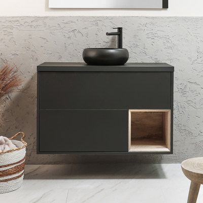 Verleihen Sie Ihrem Badezimmer mit dem hängenden 1000mm Waschtisch in Schwarzgrau inklusive LED-Beleuchtung aus der Hoxton-Kollektion mit rundem Elements-Aufsatzwaschbecken in Graphit einen eleganten Stil. Hergestellt aus robustem Holzwerkstoff, ist der hängende Waschtischunterschrank eine stilvolle und praktische Aufbewahrungslösung. Er verfügt über ein offenes Regal und zwei Schubladen, welche Ihnen viel Platz zum Aufbewahren Ihrer Toilettenartikel bieten. Das Elements-Waschbecken aus hochwertiger Keramik verfügt über eine strapazierfähige Glasur, welche leicht zu reinigen ist. Es hat kein Hahnloch und kann somit ideal mit allen unseren hohen 1-Loch Waschtischarmaturen oder Wandarmaturen kombiniert werden. Vervollständigen Sie Ihr Badezimmer mit anderen Artikeln aus der Hoxton-Kollektion und kreieren so ein perfekt aufeinander abgestimmtes Bad. Eigenschaften: Dimensionen Unterschrank: B 1000mm x T 460mm x H 636mm Dimensionen Waschbecken: B 360mm x T 360mm H 120mm Modernes Design Mit LED-Bele...