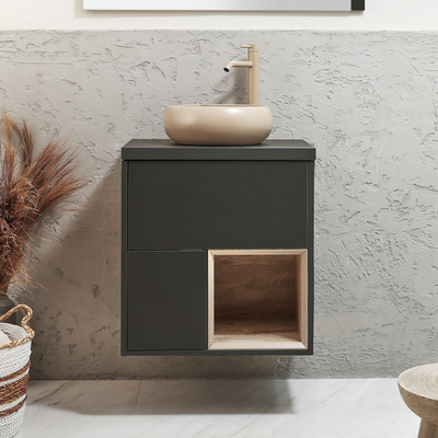 Verleihen Sie Ihrem Badezimmer mit dem hängenden 600mm Waschtisch in Schwarzgrau inklusive LED-Beleuchtung aus der Hoxton-Kollektion mit rundem Elements-Aufsatzwaschbecken in Beige (Sand) einen eleganten Stil. Hergestellt aus robustem Holzwerkstoff, ist der hängende Waschtischunterschrank eine stilvolle und praktische Aufbewahrungslösung. Er verfügt über ein offenes Regal, welches Ihnen viel Platz zum Aufbewahren Ihrer Toilettenartikel bietet. Das Elements-Waschbecken aus hochwertiger Keramik verfügt über eine strapazierfähige Glasur, welche leicht zu reinigen ist. Es hat kein Hahnloch und kann somit ideal mit allen unseren hohen 1-Loch Waschtischarmaturen oder Wandarmaturen kombiniert werden. Vervollständigen Sie Ihr Badezimmer mit anderen Artikeln aus der Hoxton-Kollektion und kreieren so ein perfekt aufeinander abgestimmtes Bad. Eigenschaften: Dimensionen Unterschrank: B 600 mm x T 460 mm x H 636 mm Dimensionen Waschbecken: B 360 mm x T 360 mm x H 120 mm Modernes Design Konstruktion aus FS...