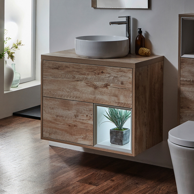 Verleihen Sie Ihrem Badezimmer mit dem hängenden Hudson Reed Hoxton 800mm Waschtisch inkl. rundem Aufsatzwaschbecken mit LED in heller Eiche einen eleganten Stil. Hergestellt aus robustem Holzwerkstoff, ist der wandmontierte Waschtischunterschrank eine stilvolle und praktische Aufbewahrungslösung. Er verfügt über ein offenes Regal, welches Ihnen viel Platz zum Aufbewahren Ihrer Toilettenartikel bieten. Das Aufsatzwaschbecken profitiert von einer strapazierbaren und pflegeleichten Glasur in Weiß sowie einer hochwertigen Keramik-Konstruktion
