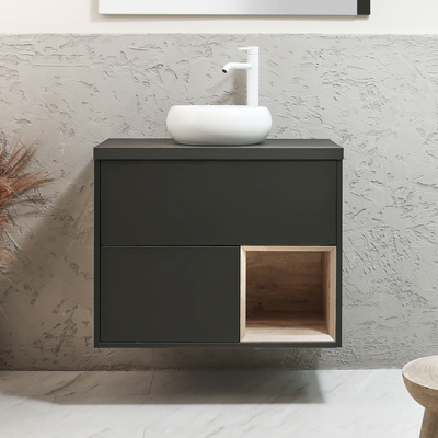Verleihen Sie Ihrem Badezimmer mit dem hängenden 800mm Waschtisch in Schwarzgrau inklusive LED-Beleuchtung aus der Hoxton-Kollektion mit rundem Elements-Aufsatzwaschbecken in Weiß (Chalk) einen eleganten Stil. Hergestellt aus robustem Holzwerkstoff, ist der hängende Waschtischunterschrank eine stilvolle und praktische Aufbewahrungslösung. Er verfügt über ein offenes Regal, welches Ihnen viel Platz zum Aufbewahren Ihrer Toilettenartikel bietet. Das Elements-Waschbecken aus hochwertiger Keramik verfügt über eine strapazierfähige Glasur, welche leicht zu reinigen ist. Es hat kein Hahnloch und kann somit ideal mit allen unseren hohen 1-Loch Waschtischarmaturen oder Wandarmaturen kombiniert werden. Vervollständigen Sie Ihr Badezimmer mit anderen Artikeln aus der Hoxton-Kollektion und kreieren so ein perfekt aufeinander abgestimmtes Bad. Eigenschaften: Dimensionen Unterschrank: B 800 mm x T 460 mm x H 636 mm Dimensionen Waschbecken: B 360 mm x T 360 mm x H 120 mm Modernes Design Konstruktion aus FS...