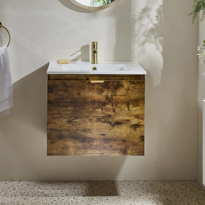 Verleihen Sie Ihrem Badezimmer einen neuen Stil mit dem hängenden 600mm Waschtischunterschrank in dunkler Eiche mit Waschbecken und Griffleiste für Möbel in satiniertem Gold. Dieser Waschtisch überzeugt mit einem klaren, minimalistischen Design und einem atemberaubenden Finish in dunkler Eiche. Der Cluo-Waschtischunterschrank ist eine stilvolle und praktische Aufbewahrungslösung für Ihre Badezimmerutensilien und verfügt über ein hängendes Design. Die Soft-Close-Schublade verhindert ein geräuschvolles Zuschlagen. Das mitgelieferte Waschbecken verfügt über eine Hahnlochvorbohrung und kann ideal mit einer unserer 1-Loch Waschtisch Armaturen kombiniert werden.Wählen Sie aus einer großen Auswahl an modernen 1-Loch Waschtisch Armaturen aus und vervollständigen so Ihren neuen Waschtischunterschrank. Eigenschaften: Dimensionen Einheit: B 594 mm x T 450 mm x H 500 mm Dimensionen Waschbecken: B 600 mm x T 460 mm x H 20 mm Stilvolle und praktische Aufbewahrungslösung für Ihre Badezimmerutensilien Sof...