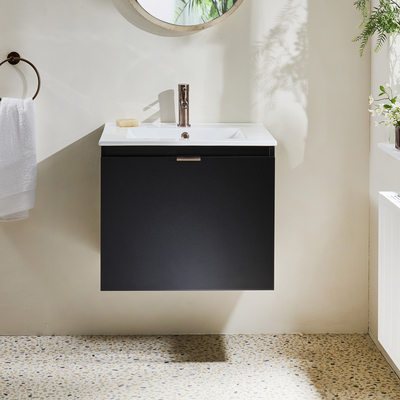 Verleihen Sie Ihrem Badezimmer einen neuen Stil mit dem hängenden 600mm Waschtischunterschrank in Schwarzgrau mit Waschbecken und Griffleiste für Möbel in gebürsteter Bronze. Dieser Waschtisch überzeugt mit einem klaren, minimalistischen Design und einem atemberaubenden Finish in Schwarzgrau. Der Cluo-Waschtischunterschrank ist eine stilvolle und praktische Aufbewahrungslösung für Ihre Badezimmerutensilien und verfügt über ein hängendes Design. Die Soft-Close-Schublade verhindert ein geräuschvolles Zuschlagen. Das mitgelieferte Waschbecken verfügt über eine Hahnlochvorbohrung und kann ideal mit einer unserer 1-Loch Waschtisch Armaturen kombiniert werden.Wählen Sie aus einer großen Auswahl an modernen 1-Loch Waschtisch Armaturen aus und vervollständigen so Ihren neuen Waschtischunterschrank. Eigenschaften: Dimensionen Einheit: B 594 mm x T 450 mm x H 500 mm Dimensionen Waschbecken: B 600 mm x T 460 mm x H 20 mm Stilvolle und praktische Aufbewahrungslösung für Ihre Badezimmerutensilien Soft-...