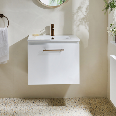 Verleihen Sie Ihrem Badezimmer einen neuen Stil mit dem hängenden 600mm Waschtischunterschrank in Weiß mit Waschbecken und modernem Möbelgriff in satiniertem Kupfer. Dieser Waschtisch überzeugt mit einem klaren, minimalistischen Design und einem atemberaubenden Finish in Weiß. Der Cluo-Waschtischunterschrank ist eine stilvolle und praktische Aufbewahrungslösung für Ihre Badezimmerutensilien und verfügt über ein hängendes Design. Die Soft-Close-Schublade verhindert ein geräuschvolles Zuschlagen. Das mitgelieferte Waschbecken verfügt über eine Hahnlochvorbohrung und kann ideal mit einer unserer 1-Loch Waschtisch Armaturen kombiniert werden.Wählen Sie aus einer großen Auswahl an modernen 1-Loch Waschtisch Armaturen aus und vervollständigen so Ihren neuen Waschtischunterschrank. Eigenschaften: Dimensionen Einheit: B 594 mm x T 450 mm x H 500 mm Dimensionen Waschbecken: B 600 mm x T 460 mm x H 20 mm Stilvolle und praktische Aufbewahrungslösung für Ihre Badezimmerutensilien Soft-Close-Schublade F...