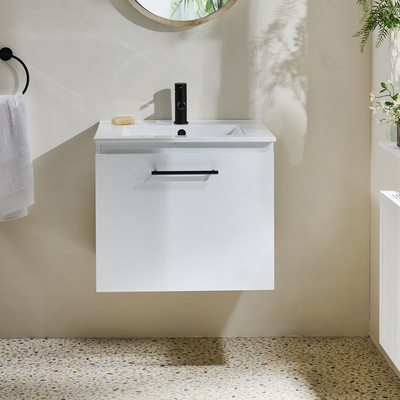 Verleihen Sie Ihrem Badezimmer einen neuen Stil mit dem hängenden 600mm Waschtischunterschrank in Weiß mit Waschbecken und modernem Möbelgriff in Schwarz. Dieser Waschtisch überzeugt mit einem klaren, minimalistischen Design und einem atemberaubenden Finish in Weiß. Der Cluo-Waschtischunterschrank ist eine stilvolle und praktische Aufbewahrungslösung für Ihre Badezimmerutensilien und verfügt über ein hängendes Design. Die Soft-Close-Schublade verhindert ein geräuschvolles Zuschlagen. Das mitgelieferte Waschbecken verfügt über eine Hahnlochvorbohrung und kann ideal mit einer unserer 1-Loch Waschtisch Armaturen kombiniert werden.Wählen Sie aus einer großen Auswahl an modernen 1-Loch Waschtisch Armaturen aus und vervollständigen so Ihren neuen Waschtischunterschrank. Eigenschaften: Dimensionen Einheit: B 594 mm x T 450 mm x H 500 mm Dimensionen Waschbecken: B 600 mm x T 460 mm x H 20 mm Stilvolle und praktische Aufbewahrungslösung für Ihre Badezimmerutensilien Soft-Close-Schublade Feuchtigkeit...