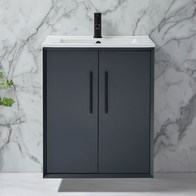 Verleihen Sie Ihrem Badezimmer einen luxuriösen neuen Farbtupfer mit dem hängenden 610mm Waschtischunterschrank mit Waschbecken in Anthrazit inklusive modernen Möbelgriffen in Schwarz. Dieser Waschtisch überzeugt mit einem klaren, minimalistischen Design und einem atemberaubenden Finish in Anthrazit. Dank seiner kompakten Konstruktion eignet sich dieser Waschtischunterschrank perfekt für kleine Badezimmer und Gäste-WCs. Der Edge-Waschtischunterschrank ist eine stilvolle und praktische Aufbewahrungslösung für Ihre Badezimmerutensilien und er verfügt über ein freistehendes Design. Die Soft-Close-Türen verhindern ein geräuschvolles Zuschlagen. Das mitgelieferte Waschbecken verfügt über eine Hahnlochvorbohrung und kann ideal mit einer unserer 1-Loch Waschtisch Armaturen kombiniert werden.Wählen Sie aus einer großen Auswahl an modernen 1-Loch Waschtisch Armaturen aus und vervollständigen Sie so Ihren neuen Waschtischunterschrank. Eigenschaften: Dimensionen gesamt: B 606 mm x T 395 mm x H 720...