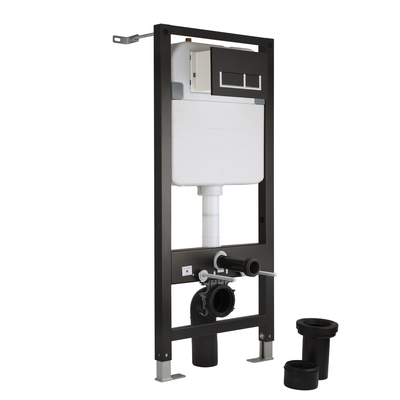 Dieser hohe Unterputzspülkasten mit Rahmen für Hänge-WCs inklusive eckiger Betätigungsplatte in Schwarz/ Silber ist die ideale Lösung Ihr Hänge-WC sicher an der Wand zu befestigen. Dieses Set überzeugt mit einer wassersparenden Zweimengenspültechnik und ist für die Verwendung mit allen wandhängenden Toilettenbecken geeignet. Der Rahmen kann in der Höhe eingestellt werden, was die Installation erleichtert. Eigenschaften: Dimensionen: B 500 mm x T 145 mm x H 1140 mm Rechteckiger Betätigungsplatte in Schwarz/ Silber Zweimengenspültechnik 6/3 Liter Kompatibel mit allen wandhängenden WC-Becken Kann in der Höhe eingestellt werden Zulauf von oben Maximale Gewichtsbelastung: 400kg