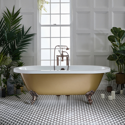 Setzen Sie mit der freistehenden 1780mm x 825mm Badewanne in Gold Metallic aus der Oxford-Kollektion ein stilvolles und gewagtes Statement in Ihrem Badezimmer. Mit dem klassischen Design, dem glänzenden Farbanstrich und den Standfüßen in geölter Bronze wird diese Badewanne mit Sicherheit zum neuen Blickfang in Ihrem Badezimmer. Dank der zwei Rückenschrägen können Sie an beiden Enden ein komfortables und entspannendes Badeerlebnis genießen, ob alleine oder zu zweit. Die Badewanne wurde aus hochwertigem Acrylgefertigt und bietet Ihnen somit langlebige Stabilität, eine angenehm warme Oberfläche und eine Oberfläche, die resistent gegen Verfärbungen und Kratzer ist. Verleihen Sie Ihrer Wanne mit einer unserer freistehenden oder W&-Wannenarmaturen den letzten Schliff und kombinieren Sie das Ensemble mit weiteren Artikeln aus der Oxford Kollektion, um einen abgestimmten Badezimmer-Look zu erzielen. Eigenschaften: Dimensionen: H 610mm x B 825mm x L 1780mm Badewannen-Füße in geölter Bronze Glänze...