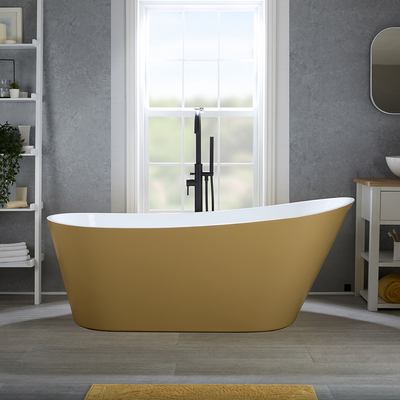 Setzen Sie mit der modernen freistehenden 1500mm x 750mm Badewanne mit einer Rückenschrägen in Gelb (Honey Yellow) inkl. Überlauf in Schwarz aus der Otterton-Kollektion ein stilvolles und gewagtes Statement in Ihrem Badezimmer. Das moderne Design und der glänzende Farbanstrich in Gelb (Honey Yellow) wird in Ihrem Badezimmer zum garantierten Blickfang. Dank der Rückenschräge können Sie ein komfortables und entspannendes Badeerlebnis genießen. Die Badewanne wurde aus hochwertigem Acrylgefertigt und bietet Ihnen somit langlebige Stabilität, eine angenehm warme Oberfläche und eine Oberfläche, die resistent gegen Verfärbungen und Kratzer ist. Verleihen Sie Ihrer Wanne mit einer unserer freistehenden oder W&-Wannenarmaturen den letzten Schliff und kombinieren Sie das Ensemble mit weiteren Artikeln aus der Otterton Kollektion, um einen abgestimmten Badezimmer-Look zu erzielen. Eigenschaften: Dimensionen: 1500mm x 750mm x 670mm Strapazierfähiges Glanzfinish in Gelb (Honey Yellow) Modernes Design...