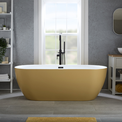 Setzen Sie mit der modernen freistehenden 1500mm x 750mm Badewanne mit zwei Rückenschrägen in Gelb (Honey Yellow) inkl. Überlauf in Schwarz aus der Otterton-Kollektion ein stilvolles und gewagtes Statement in Ihrem Badezimmer. Das moderne Design und der glänzende Farbanstrich in Gelb (Honey Yellow) wird in Ihrem Badezimmer zum garantierten Blickfang. Dank der zwei Rückenschrägen können Sie ein komfortables und entspannendes Badeerlebnis genießen. Die Badewanne wurde aus hochwertigem Acryl gefertigt und bietet Ihnen somit langlebige Stabilität, eine angenehm warme Oberfläche und eine Oberfläche, die resistent gegen Verfärbungen und Kratzer ist. Verleihen Sie Ihrer Wanne mit einer unserer freistehenden oder W&-Wannenarmaturen den letzten Schliff und kombinieren Sie das Ensemble mit weiteren Artikeln aus der Otterton Kollektion, um einen abgestimmten Badezimmer-Look zu erzielen. Eigenschaften: Dimensionen: 1500mm x 750mm x 580mm Strapazierfähiges Glanzfinish in Gelb (Honey Yellow) Modernes...
