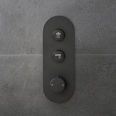 Gestalten Sie einen modernen Duschbereich in Ihrem Badezimmer mit der einfach zu Bedienenden Unterputz-Duscharmatur mit Drucktasten in Schwarz für 2 Verbraucher. Die thermostatische Duscharmatur aus massivem Messing verfügt über eine robuste Oberfläche in Schwarz und eine einfach zu bedienende Druckknopfsteuerungen. Sie ermöglichen Ihnen den Wechsel zwischen den zwei Funktionen, aber Sie können diese zwei Funktionen auch gleichzeitig verwenden. Die Armatur verfügt zudem über eine Verbrühungsschutztechnologie, die jedes Mal eine sichere und komfortable Dusche gewährleistet. Vervollständigen Sie das Design Ihres Badezimmers mit weiteren Artikeln aus der Idro-Kollektion. Eigenschaften: Dimensionen: B 90 mm x T 123 mm x H 238 mm Modernes Design Einfach zu bedienende Drucktastensteuerung Thermostatische Temperaturregelung Austauschbare Druckknopfabdeckungen für eine individuelle Anpassung Runder Hebelgriff regelt die Temperatur Duschventil aus Messing mit hochwertiger Oberfläche in Schwarz Steuert zwe...