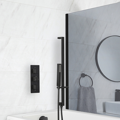 Verleihen Sie Ihrem Bad einen zeitgenössischen Look mit einem Hauch Eleganz! Das mattschwarze Duschsystem aus der Preto Kollektion besteht aus einer thermostatischen Unterputz-Armatur, einem Brausestangenset und einem Überlauf-Wanneneinlauf. Die aus massivem Messing gefertigte Duscharmatur bietet Ihnen dabei langlebige Haltbarkeit und eine benutzerfreundliche Regulierung des Wassers. Das Unterputz-Design wird dabei durch die eckigen Griffe zur Schau gestellt und dank des einbauten Verbrühschutzes können Sie sich auf ein sicheres Duscherlebnis verlassen. Die Kombination aus Wanneneinlauf und -Ablauf wird in den Überlauf Ihrer Wanne eingesetzt, wodurch auf Hähne verzichtet werden kann und ein modernes Flair erzielt wird. Außerdem lässt sich die Handbrause schnell und einfach in der Höhe verstellen. Mit diesem multifunktionalen System können die beiden Funktionen gemeinsam oder getrennt genutzt werden. Kombinieren Sie das Ensemble mit anderen Artikeln aus der Preto Kollektion, um eine zeitgen...