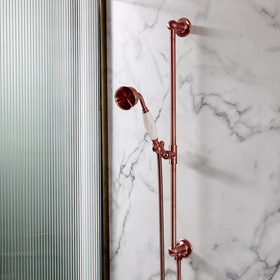Verleihen Sie Ihrem Badezimmer einen klassischen Charme mit dem Retro Brausestangenset in satiniertem Kupfer mit Handbrause und integriertem Auslassbogen. Mit einer strapazierfähigen Oberfläche in satiniertem Kupfer und weißen Keramikdetails kombiniert das Brausestangenset ein elegantes Design mit hervorragender Funktionalität. Die Messing-Handbrause mit Keramikgriff liefert einen erfrischenden Wasserstrahl und kann auf die gewünschte Höhe eingestellt werden. Kombinieren Sie dieses Assemblee mit einem unserer Retro Duschventile in satiniertem Kupfer sowie anderen Artikeln aus der Elizabeth-Kollektion für ein schönes traditionelles Badezimmer und eine perfekt abgestimmte Optik. Eigenschaften: Dimensionen: B 60mm x T 60mm x H 688mm Wunderschönes traditionelles Design Langlebige massive Messingkonstruktion mit Oberfläche in satiniertem Kupfer Handbrause aus Messing mit ergonomisch geformtem Griff aus Keramik 1.5m Duschschlauch 1/2” Anschluss Empfohlener Mindestbetriebsdruck: 0, 5 bar 10 Jah...