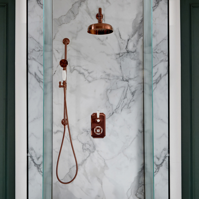 Setzen Sie mit dem traditionellen Duschsystem in satiniertem Kupfer aus der Elizabeth Kollektion ein stilvolles Statement in Ihrem Badezimmer. Vervollständigt wird es aus einer Unterputz-Armatur, einem runden 205mm Duschkopf zur Wandmontage und einem Brausestangenset. Die Duscharmatur aus langlebigem Messing bietet Ihnen dabei eine mühelose Regulierung des Wassers und der Temperatur, während der integrierte Verbrühschutz ein sicheres und sorgloses Duschen verspricht. Das Unterputz-Design wird durch die strapazierbare Beschichtung in satiniertem Kupfer gekonnt in Szene gesetzt. Genießen Sie mit dem runden Duschkopf einen luxuriösen Regenwasserguss und ein rundum wohltuendes Duscherlebnis. Die Handbrause erzeugt einen erfrischenden Wasserstrahl und lässt sich zudem schnell und einfach in der Höhe verstellen. Kombinieren Sie das Ensemble mit anderen gleichfarbigen Artikeln aus der Elizabeth Kollektion, um eine stimmige Badeinrichtung mit Retro-Optik zu erzielen. Eigenschaften: Traditionelles...