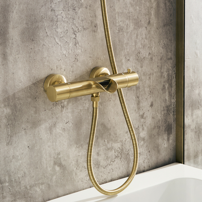 Die Thermostat-Wannenarmatur in satiniertem Gold aus der Arlo- Kollektion verbindet modernes Design mit hervorragender Funktionalität. Sie überzeugt mit einem robusten Finish in satiniertem Gold und modernen, geometrischen Formen, welche jedem Badezimmer schmeicheln. Das thermostatische Duschventil ermöglicht eine mühelose Steuerung von Wasserfluss und Temperatur und sorgt mit der Verbrühungsschutztechnologie jederzeit für ein sicheres und komfortables Dusch- oder Badeerlebnis. Eigenschaften: Dimensionen: B 280mm x T 140mm x H 60mm Thermostatische Temperaturregelung Drei-Wege-Umsteller Finish in satiniertem Gold Aus massivem Messing 1/2" Anschluss Empfohlener Wasserdruck: 2, 0 bar