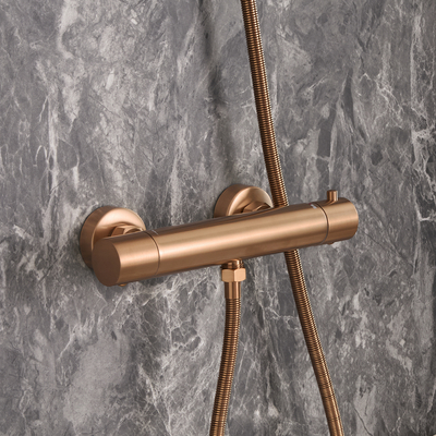 Das thermostatische Duschventil in gebürsteter Bronze aus der Elsie-Kollektion verbindet modernes Design mit hervorragender Funktionalität. Es überzeugt mit einem robusten Finish in gebürsteter Bronze und modernen, geometrischen Formen, welche jedem Badezimmer schmeicheln. Das thermostatische Duschventil ermöglicht eine mühelose Steuerung von Wasserfluss und Temperatur und sorgt mit der Verbrühungsschutztechnologie jederzeit für ein sicheres und komfortables Dusch- oder Badeerlebnis. Eigenschaften: Dimensionen: B 272mm x T 100mm x H 60mm Thermostatische Temperaturregelung Finish in gebürsteter Bronze Duschventil aus massivem Messing 1/2" Anschluss Empfohlener Wasserdruck: 1, 0 bar