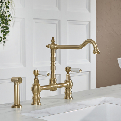 Mit der Brückenarmatur in satiniertem Gold aus der Elizabeth Kollektion sorgen Sie in Ihrer Küche für einen zauberhaften Blickfang und ein nostalgisches Ambiente. Das Modell überzeugt mit einem eleganten Design, das durch das strapazierbare Finish in satiniertem Gold so richtig zur Geltung kommt. Hinzu kommen die Keramikgriffe zur mühelosen Regulierung des Wassers, der schwenkbare Hahn sowie die ausziehbare Spülbrause, die den Abwasch erheblich erleichtert. Dabei besteht das Modell zudem aus massivem Messing und garantiert somit langlebige Haltbarkeit, während die integrierte Keramikscheiben-Technologie zur Vermeidung von Leckagen beiträgt. Eigenschaften: Dimensionen: B 360mm x T 313mm x H 276mm Klassisches und elegantes Design – perfekt für traditionelle Kücheneinrichtungen Langlebige Konstruktion aus massivem Messing mit wasserfleckenresistentem Finish in satiniertem Gold Herausziehbare Spülbrause mit 1, 5m Schlauch Keramikgriffe ermöglichen mühelose Regulierung des Wasserflusses und der -t...